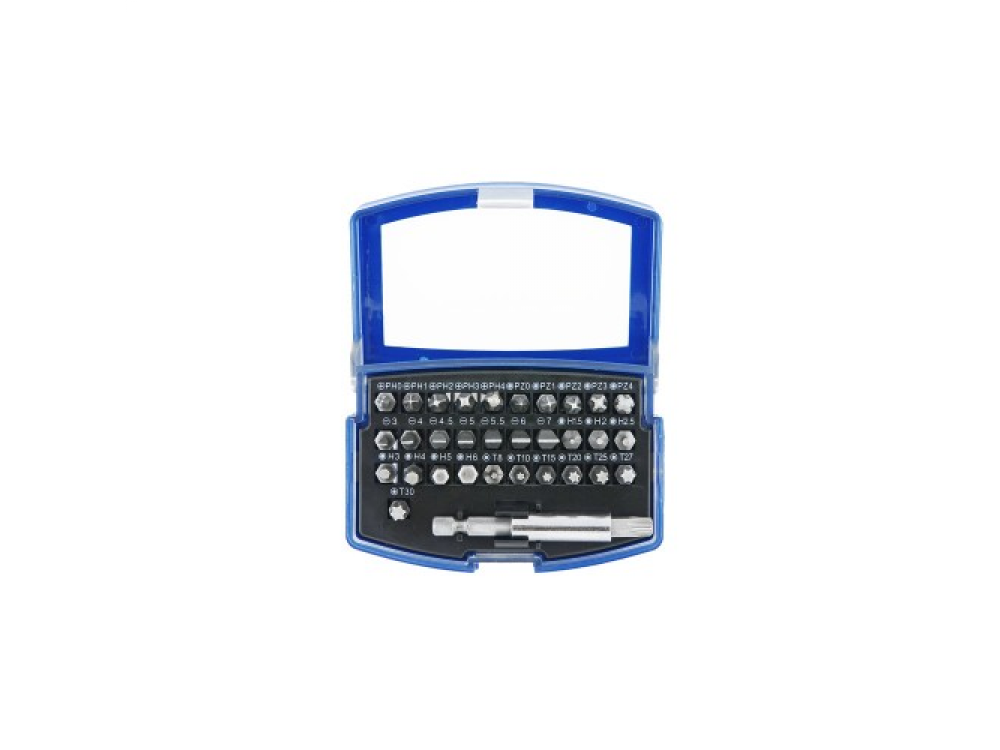 Биты-вставки 32 (шт.):Torx (8 шт.): T8,T10,T15,T20,T25,T27,T30,T40 Hex (7 шт.): 1,5, H2,H2.5,H3,H4,H5,H6Шлицевые (7 шт.): Sl3,Sl4, Sl4.5, Sl5,Sl5.5,Sl6,Sl7Крестовые (10 шт.): Ph0,Ph1,Ph2, Ph3, Ph4,Pz0,Pz1,Pz2,Pz3,Pz4