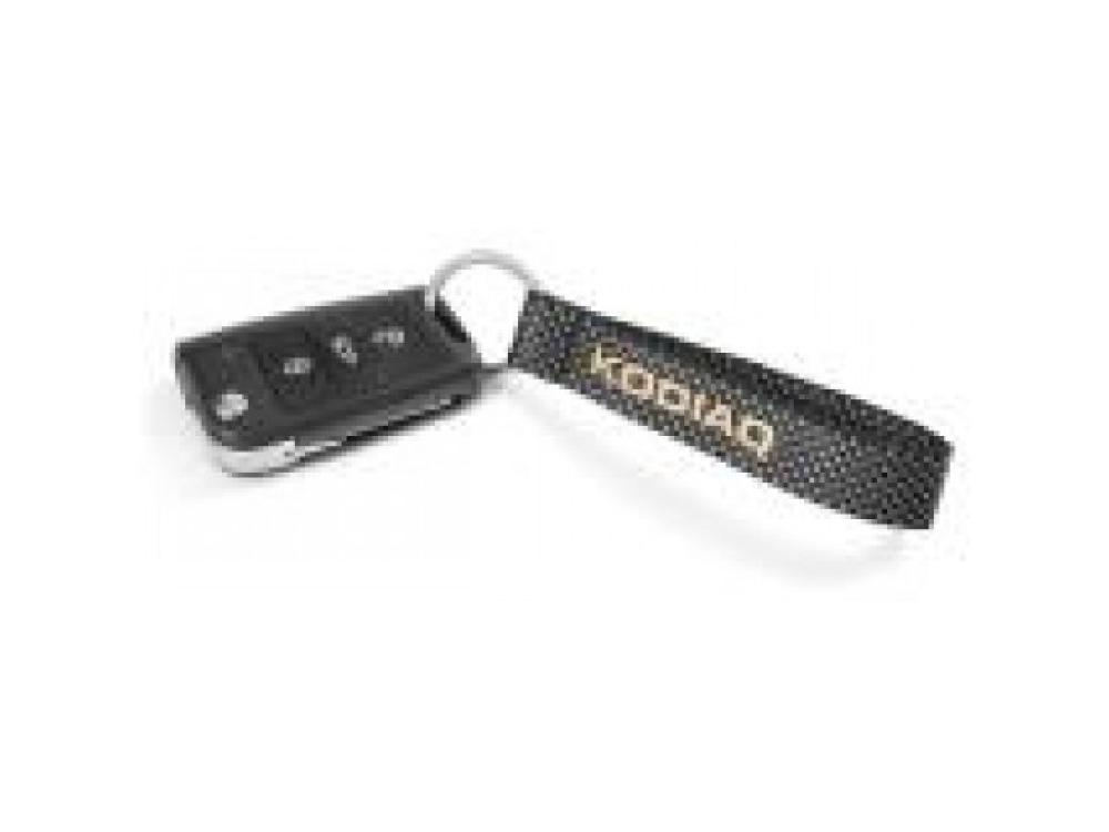 Текстильный брелок с надписью Kodiaq. Стилизация под ячеистую структуру карбона. Общая длина брелока: 14 см. Материал: полиэстер