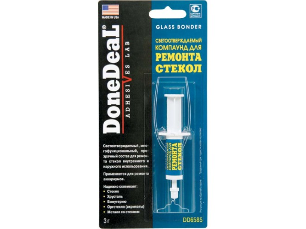 Адгезив для приклеивания стекла DONE DEAL GLASS BONDER. Надежно склеивает стекло, хрусталь, бижутерию, оргстекло и металл со стеклом. Предназначен для внутреннего и наружного использования. Восстанавливает прозрачность и оптические свойства стекла. После отверждения безвреден, может использоваться для ремонта аквариумов. Время схватывания – 5-20 сек. (при солнечном свете), 1-2 мин. (при облачности), отвердевания – 10-15 мин., полной полимеризации – 24 часа.