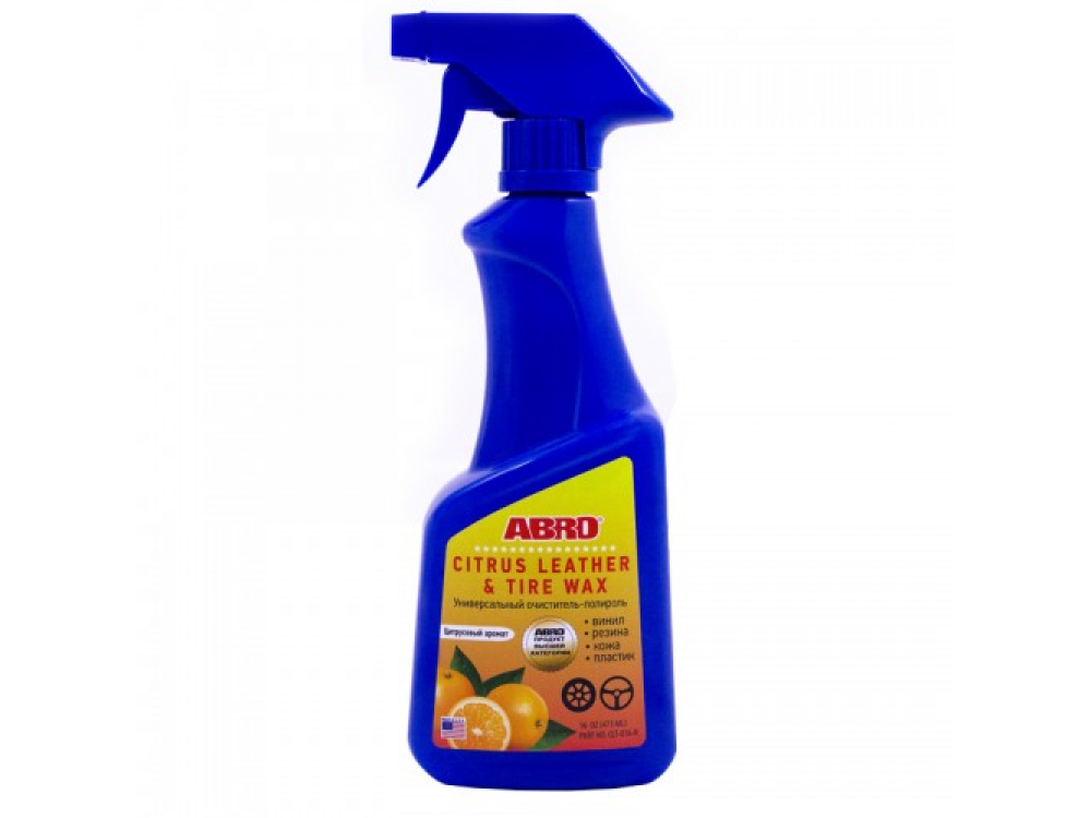 Благодаря своей комплексной формуле полироль-очиститель универсальная ABRO является незаменимым средством в вашем автомобиле. Особенности: Придает поверхности естественный блеск и ухоженный вид. Эффективно очищает въевшуюся грязь и пыль с внутренних и внешних деталей автомобиля. Создает защитную пленку на поверхности, предотвращающую выцветание под воздействием УФ-лучей. Имеет удобный распылитель и обладает приятным ароматом апельсина. Рекомендуется для обработки изделий из пластика, винила, кожи, резины. Для внутренних и внешних деталей автомобиля: приборная панель, пластиковые и кожаные детали салона, покрышки, неокрашенные бамперы. В быту для ухода за сумками, ремнями, обувью, мебелью из кожи и т. д.