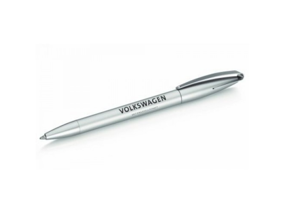 Оригинальная шариковая ручка из официальной коллекции Volkswagen 2013 года. Изготовлена из металла и пластика, имеет поворотный механизм и стержень с синими чернилами. Цвет корпуса: серебристый.