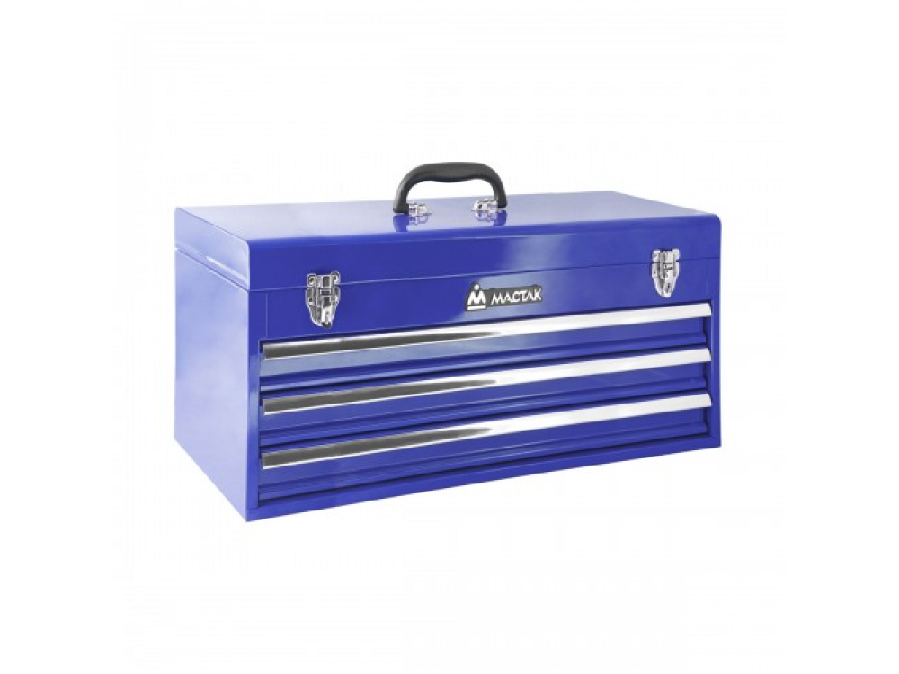 Ящик инструментальный, 3 полки, синий 511-03530B служит для организации рабочего места в любом производственном помещении, на станциях технического обслуживания или авторемонтных мастерских, хранение инструмента, мобильность. Технические характеристики: - Тип ящика: 1 верхний отсек, 3 выдвижные полки - Размеры отсека: 510 х 200 х 90 мм - Размеры выдвижных полок: 380 х 195 х 47 мм - Замок верхнего отсека: 2 шт., металлический, тип фиксатора CLIP-LOCK - Материал: сталь - Покрытие: порошковая окраска - Цвет: синий - Габариты: 530 х 220 х 285 мм - Вес: 8,7 кг