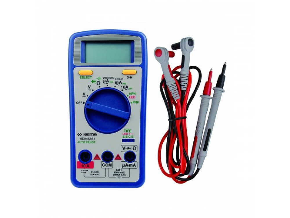 Мультиметр цифровой KING TONY Назначение: - С помощью мультиметра KING TONY 9DM1361 можно проводить измерения постоянного и переменного напряжения в цепи, постоянного тока, сопротивления всей электрической цепи или ее участка. Область применения: - Станции технического обслуживания (СТО), автосервисы, автомастерские. Особенности: - Автоматический диапазон измерений; - Автоматическое отключение питания; - Индикатор полярности (при неправильном подключении); - Функция HOLD – фиксация результатов измерений; - Сертификация CE: EN61010-1, 600V CATII, 300V CATIII. Технические характеристики: Наименование: Значение: Напряжение DC (0,1 мВ ~ 600 В) 200 мВ / 2 В / 20 В / 200 В / 600 В Напряжение AC (0,001 В ~ 600 В) 2 В / 20 В / 200 В / 600 В Ток DC (0.1uA ~ 10A) 200uA / 2000uA / 20mA / 2A / 10A Ток AC (0.1uA ~ 10A) 200uA / 2000uA / 20mA / 2A / 10A Сопротивление (0.1? ~ 20M?) 200? / 2k? / 20k? / 200k? / 2M? / 20M? Режим «прозвонка» Есть Диодный тест Есть HFE (NPN, PNP) Есть Проверка светодиодов Есть Индикатор разряженной батареи Есть LCD дисплей 3-1/2" Габаритные размеры, мм 138 ? 70 ? 32 Вес, кг 0,085