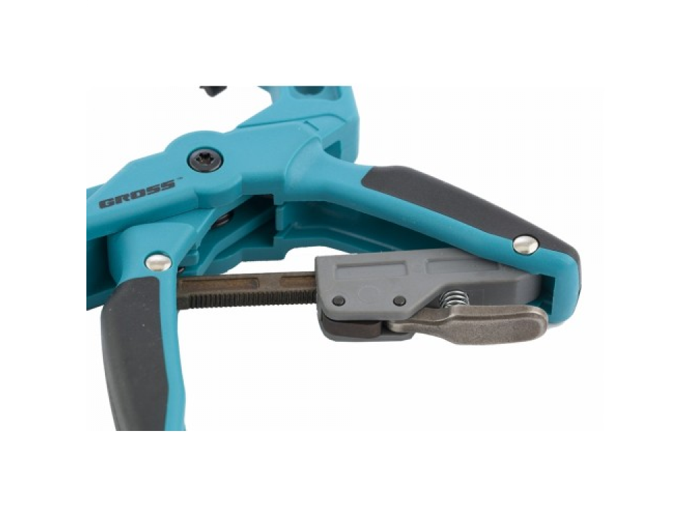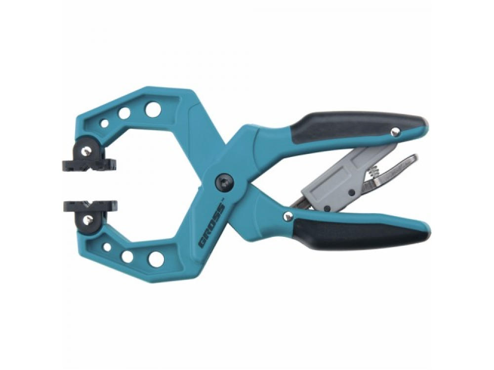 Струбцина клещеобразная торговой марки GROSS предназначена для фиксации и удержания деталей и заготовок различных конструкций диаметром до 38 мм. Прижимные накладки на шарнирах позволяют размещать деталь под разными углами. Храповой механизм обеспечивает надежную и жесткую фиксацию заготовок/деталей в отличие от механизма пружинных струбцин прищепочного типа. При нажатии на курок происходит мгновенное раскрытие струбцины. Двухкомпонентная рукоятка позволяет комфортно удерживать инструмент в руке при эксплуатации.
