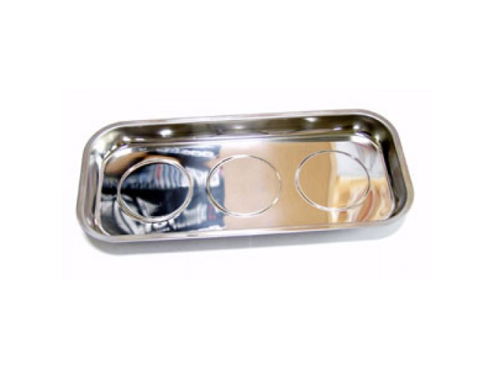 Поддон прямоугольной формы 360х165 мм, применяется для удержания во время ремонта техники железосодержащих деталей и инструментов средних размеров (болты, гайки, шайбы, ключи, торцевые головки, ШГИ и т.д.). В поддоне надежно удерживаются детали в горизонтальном, вертикальном и перевернутом положении. Суммарная масса удерживаемых деталей может составлять до 5.5 кг, в вертикальном положении тарелки и 4.4 кг в перевернутом, благодаря применению трех мощных неодимовых магнитов. Крышки магнитов, изготовленные из мягкой резины, защищают поверхности от возможных повреждений.